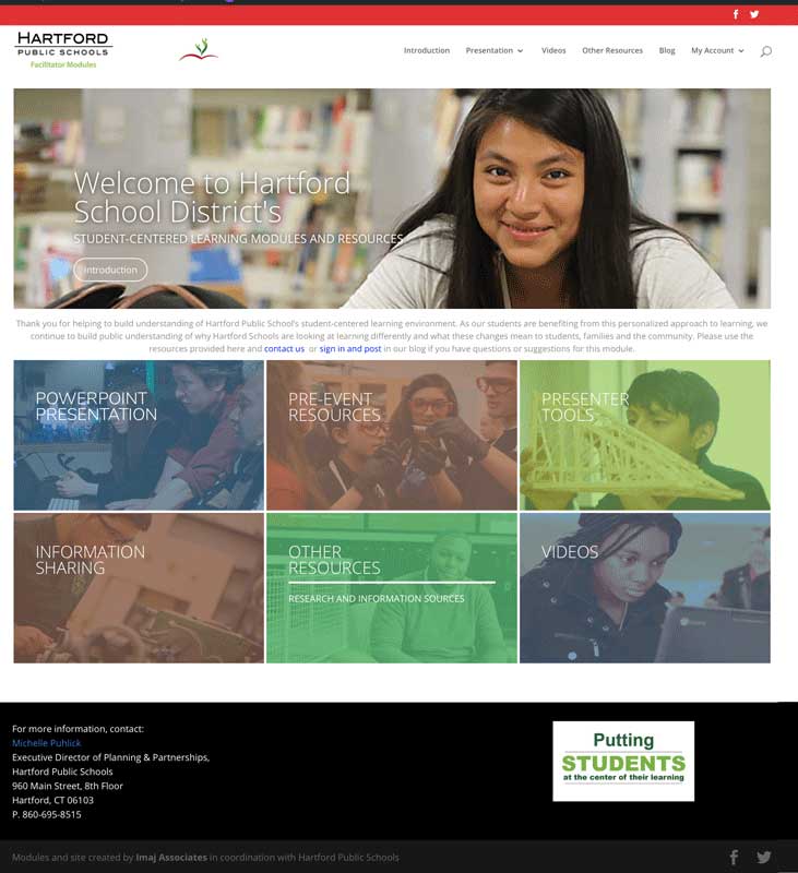 Imaj has partnered with Hartford Public Schools (HPS) to create several high-leverage communications projects aimed at advancing their student-centered learning (SCL) throughout the district and the City. One of the most integrated and successful has been the development of web-based modules for facilitators, the first of which focused on creating a better understanding of SCL within the community.