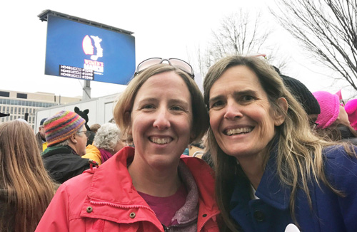 WORKING FOR A CAUSE: Katie Wetherby, of Cranston, a member of the Imaj Associates team and who served as the art director for the production, attended the march in DC last year to provide art direction and support the cause. She took part in the Providence Rally this year. She is pictured with one of her friends, Melissa Carden who is a former resident of Edgewood, at the Women’s March last year in DC.